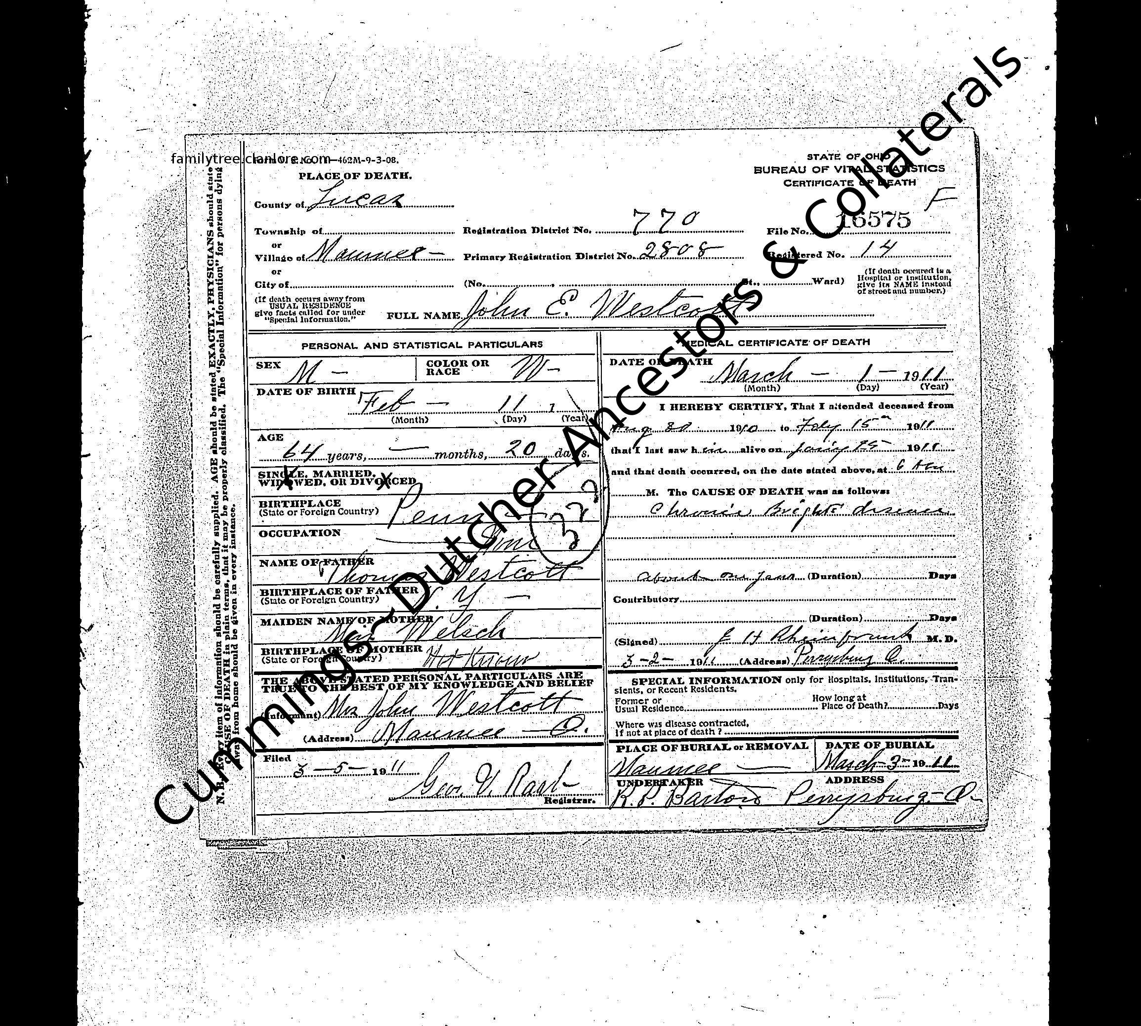"Ohio Deaths, 1908-1953," database with images, FamilySearch (https://familysearch.org/ark:/61903/1:1:X8D9-1FF : 8 December 2014), Thomas Westcott in entry for John E Westcott, 01 Mar 1911; citing Maumee, Lucas, Ohio, reference fn 16575; FHL mic rofilm 1,952,819. |