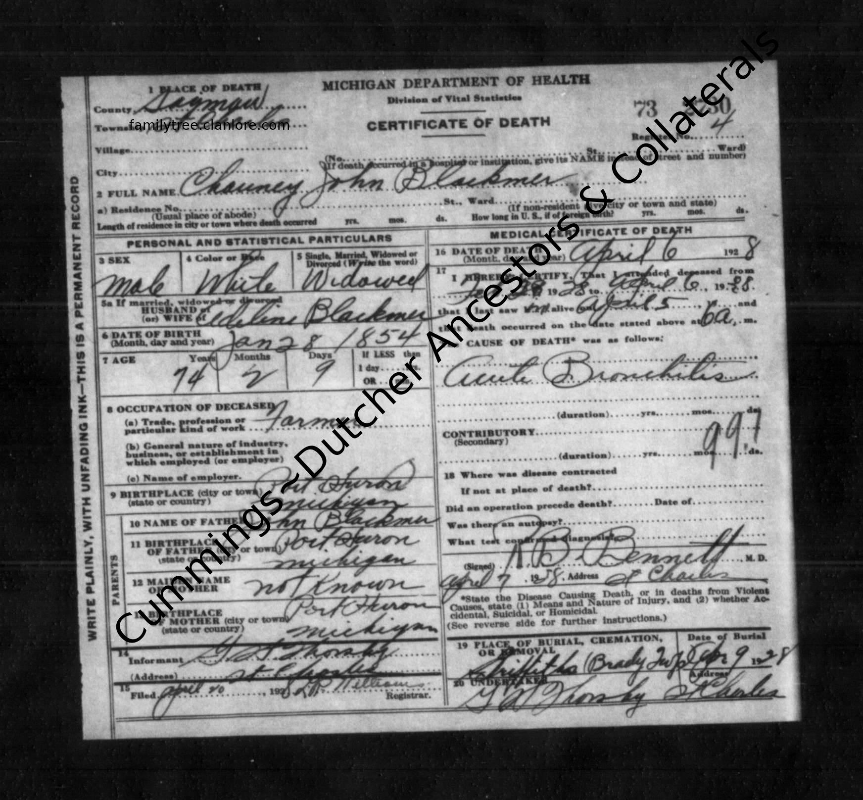 "Michigan, Death Certificates, 1921-1952," index, FamilySearch (<u>https://familysearch.org/ark:/61903/1:1:KF7Q-HBZ</u> : accessed 31 May 2015), John Blackmer in entry for Chauncy John Blackmer, 06 Apr 1928; citing St Charles, Saginaw, Michigan , United States, Division for Vital Records and Health Statistics, Lansing; FHL microfilm 1,973,078.