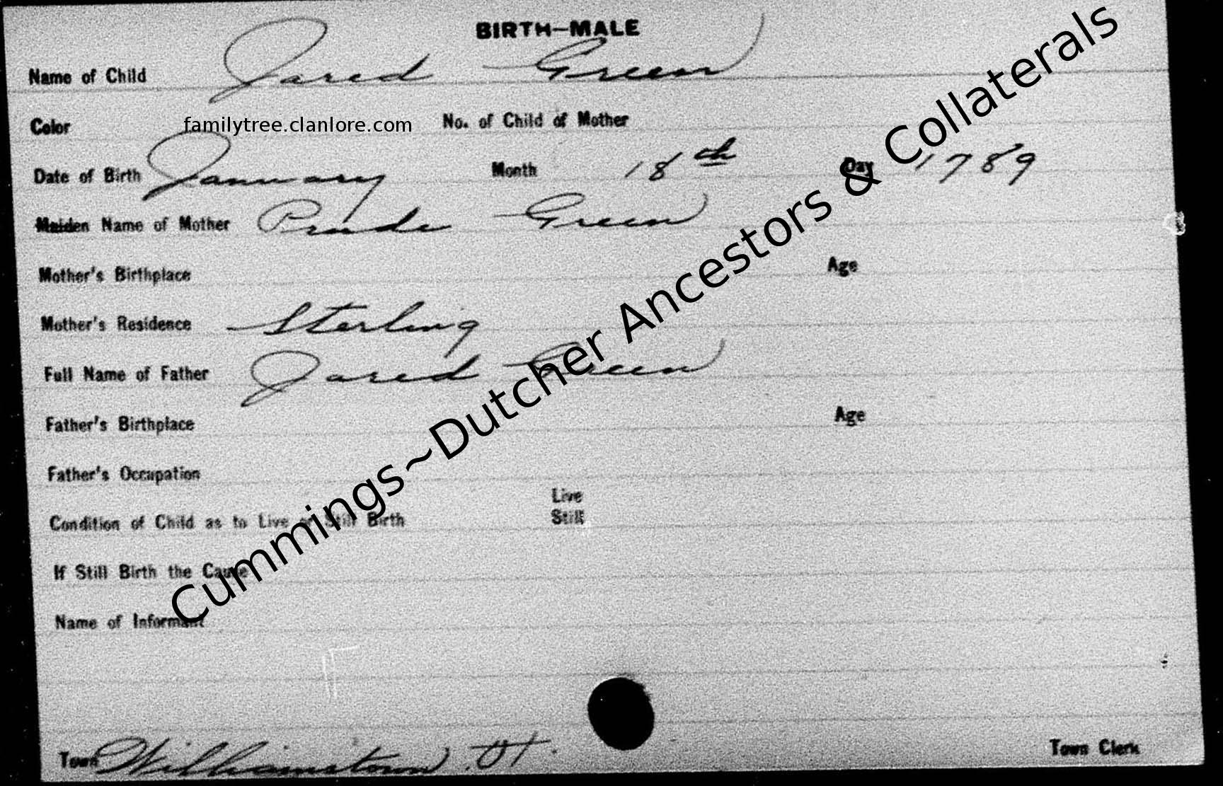 "Vermont, Vital Records, 1760-1954," index and images, <i>FamilySearch</i> (https://familysearch.org/pal:/MM9.1.1/XFV4-ZNT : accessed 31 Aug 2014), Jared Green, 18 Jan 1789, Birth; citing State Capitol Building, Montpelier; FHL microfilm 0027565 . |
