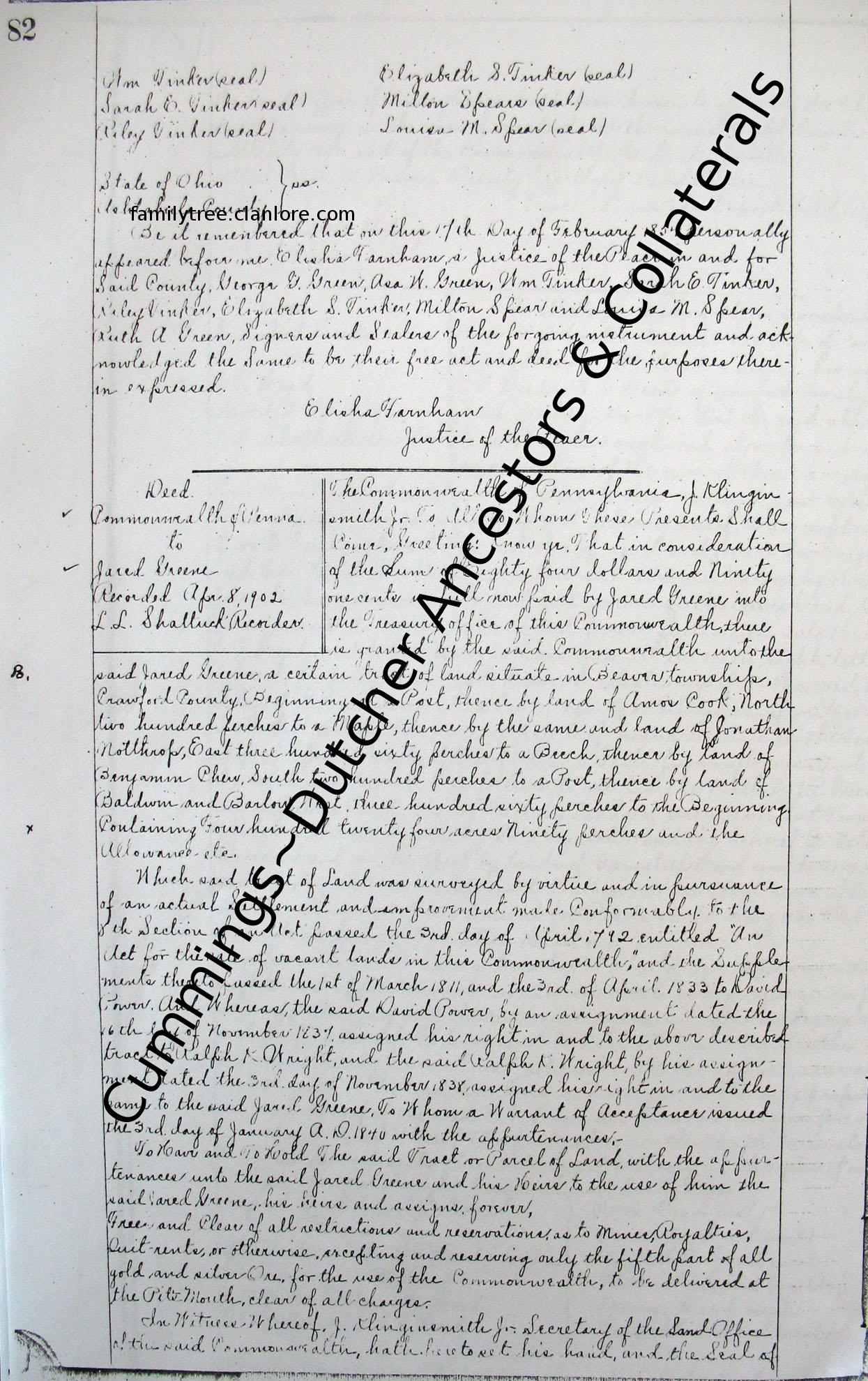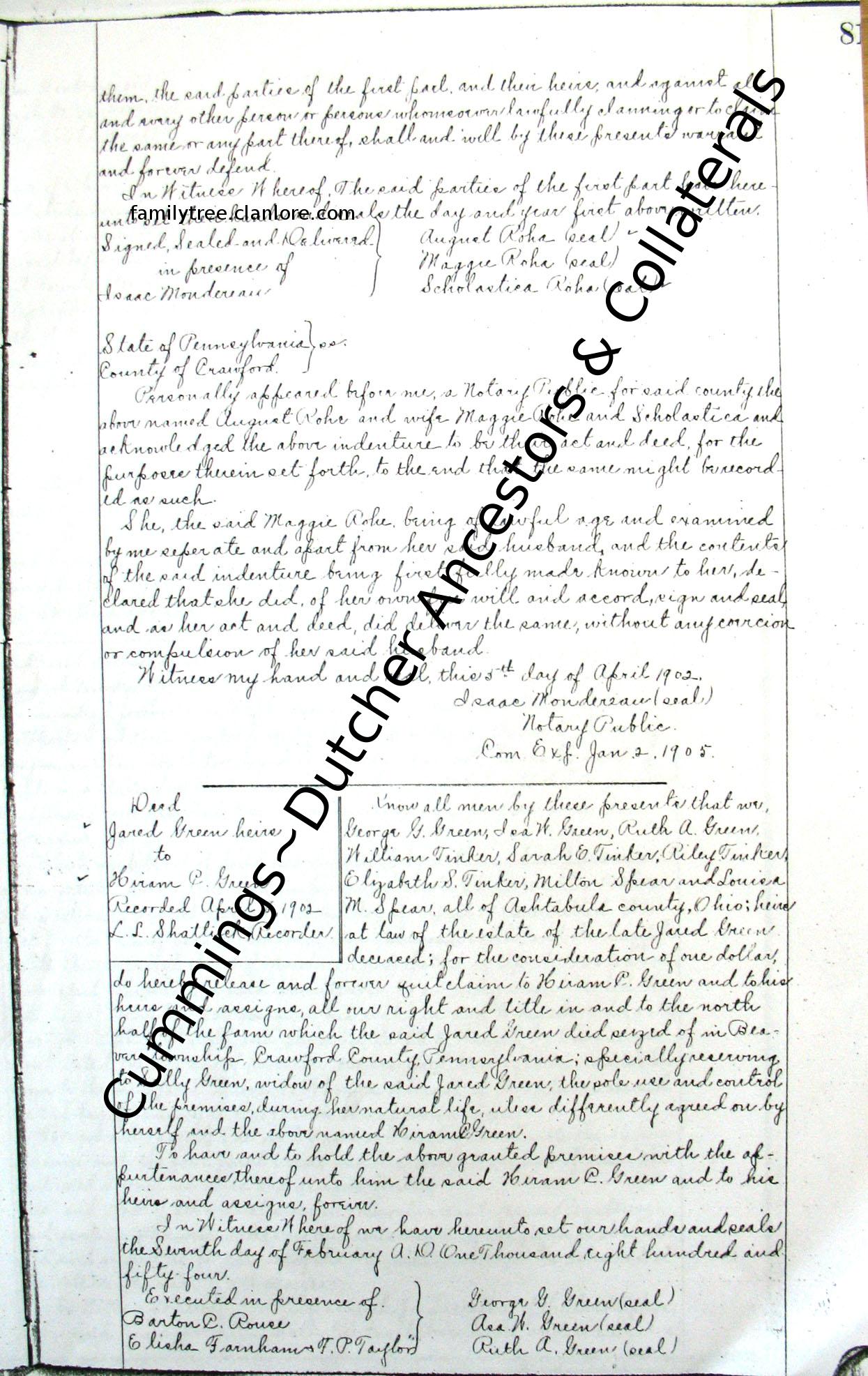 Know all men by these presents that we, George G. Green, Isa W. Green, Ruth A. Green, William Tinker, Sarah E. Tinker, Riley Tinker, Elizabeth S. Tinker, Milton Spear and Louisa M. Spear, all of Ashtabula county,Ohio; heirs at law of th e estate of the late Jared Green deceased; for the consideration of one dollar, do hereby release and forever quit claim to Hiram C. Green and to his heirs and assigns, all our right and title in and to the north half of the farm which the sai d Jared Green died seized of in Beavar Township, Crawford County, Pennsylvania; specially reserving to Sally Green, widow of the said Jared Green, the pole use and control of the premises during her natural life, unless differently agreed on b y herself and the above named Hiram C. Green.