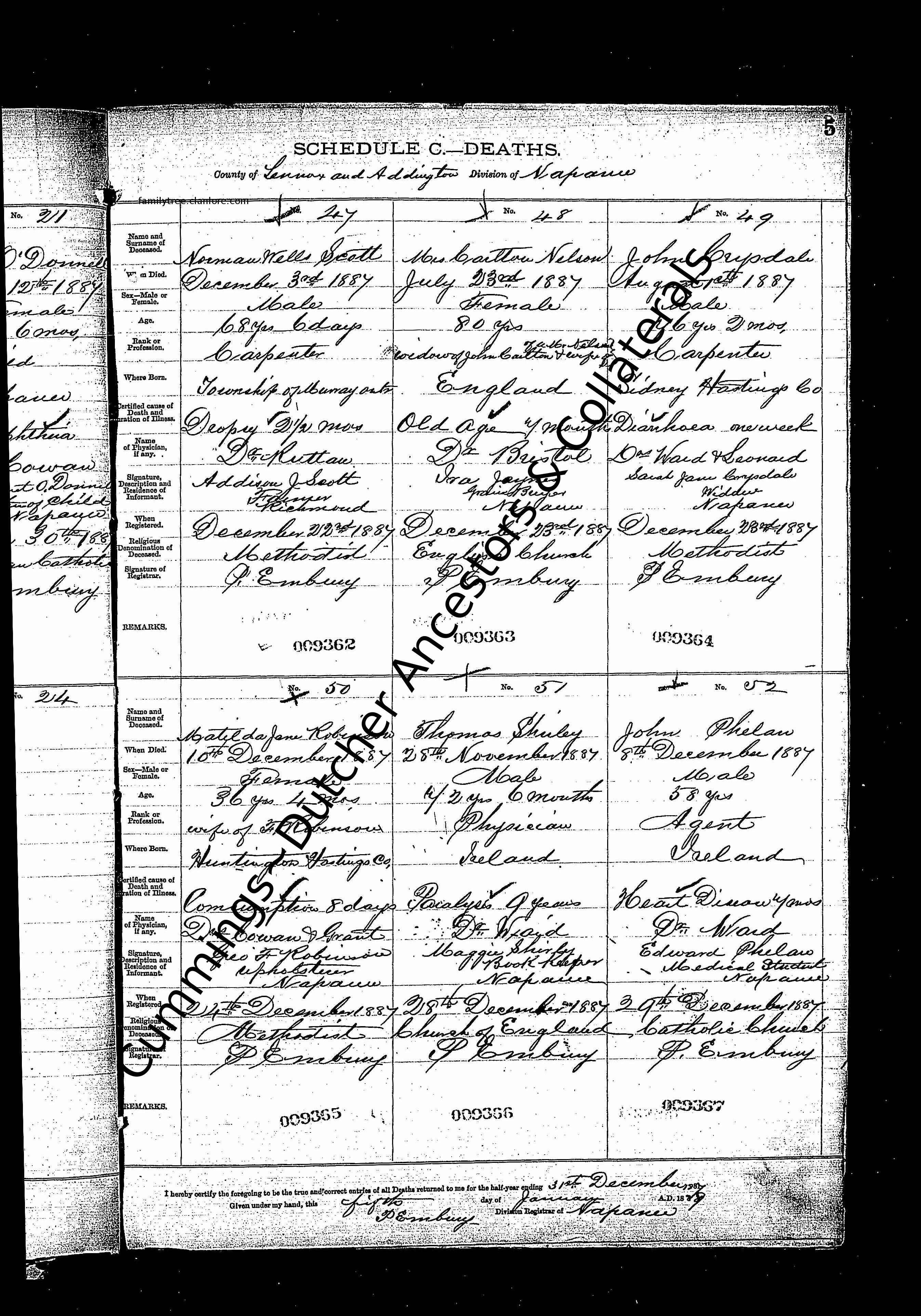 "Ontario Deaths, 1869-1937 and Overseas Deaths, 1939-1947," database with images, FamilySearch (https://familysearch.org/ark:/61903/1:1:JNNV-TJ2 : 24 June 2015), Thomas Shirley, 28 Nov 1887; citing Napanee, Lennox & Addington, Ontario, Canada, y r 1887 cn 9366, Archives of Ontario, Toronto; FHL microfilm 1,853,486.