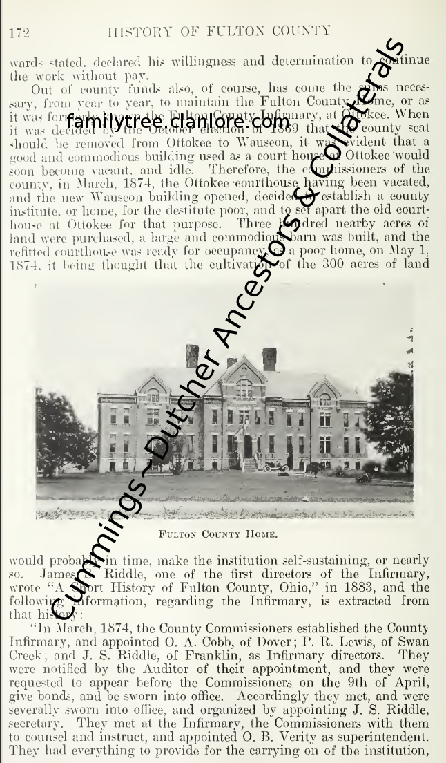 "Out of county funds also, of course, has come the sums neces- sary, from vear to year, to maintain the Fulton County Home, or as it was formerly known the Fulton County Infirmary, at Ottokee. When it was decided by the October election "of 186 9 that the county seat should be removed from Ottokee to Wauseon, it was evident that a good and commodious building used as a court house at Ottokee would soon become vacant, and idle. Therefore, the commissioners of the county, in March, 1874 , the Ottokee -courthouse having been vacated, and the new Wauseon building opened, decided to establish a county institute, or home, for the destitute poor, and to set apart the old court- house at Ottokee for that purpose. Three hundred nearb y acres of land were purchased, a large and commodious barn was built, and the refitted courthouse was ready for occupancy, as a poor home, on May 1. 1874. it being thought that the cultivation of the 300 acres of land would probably in time, ma ke the institution self-sustaining, or nearly so.