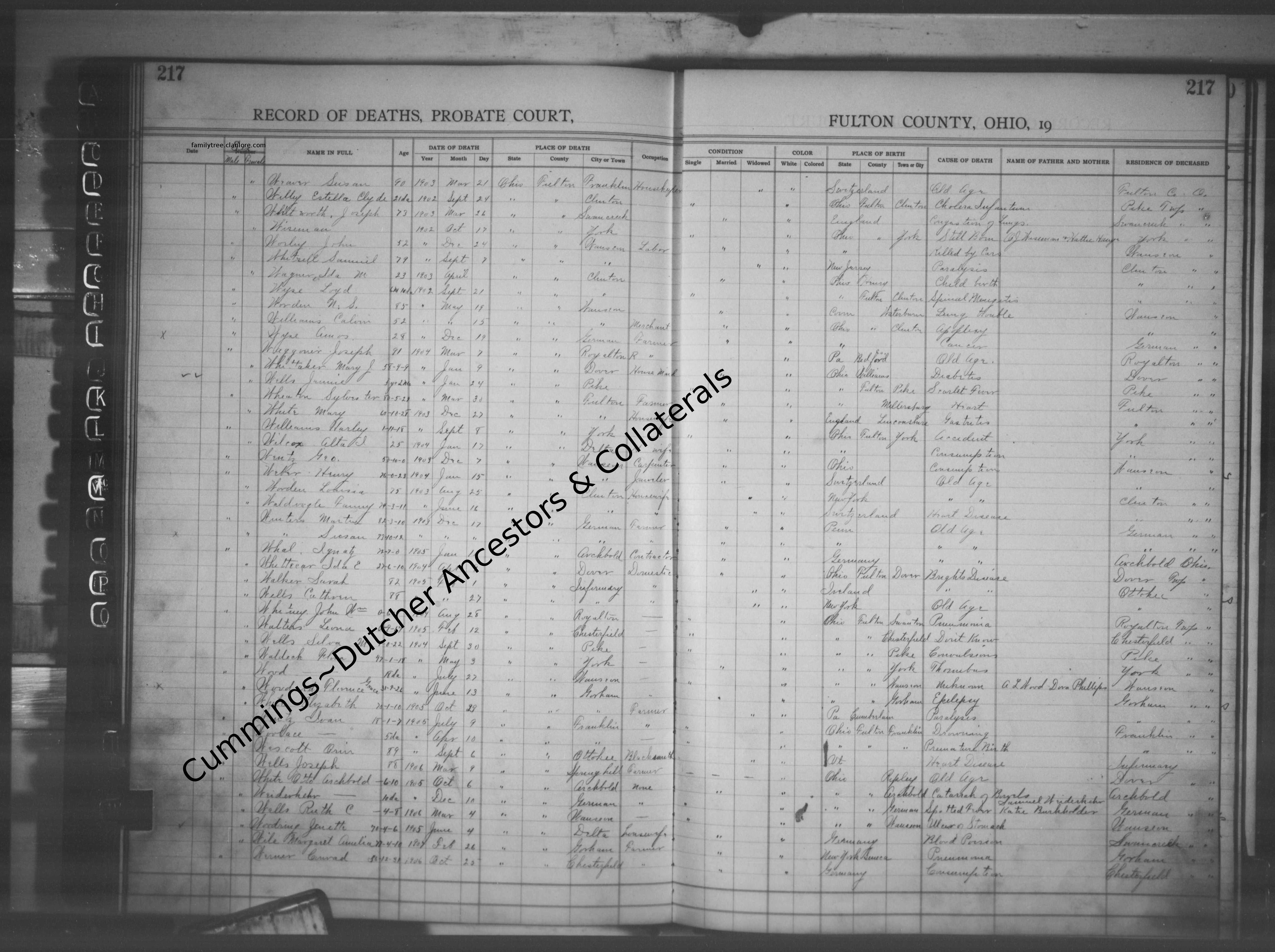 "Ohio, County Death Records, 1840-2001," database with images, FamilySearch (https://familysearch.org/ark:/61903/1:1:F62J-7Z5 : 13 December 2014), Orin Wescott, 06 Sep 1905; citing Death, Ottokee, Dover Township, Fulton, Ohio, United States, sou rce ID v3 p217 ln38, County courthouses, Ohio; FHL microfilm 423,615. |