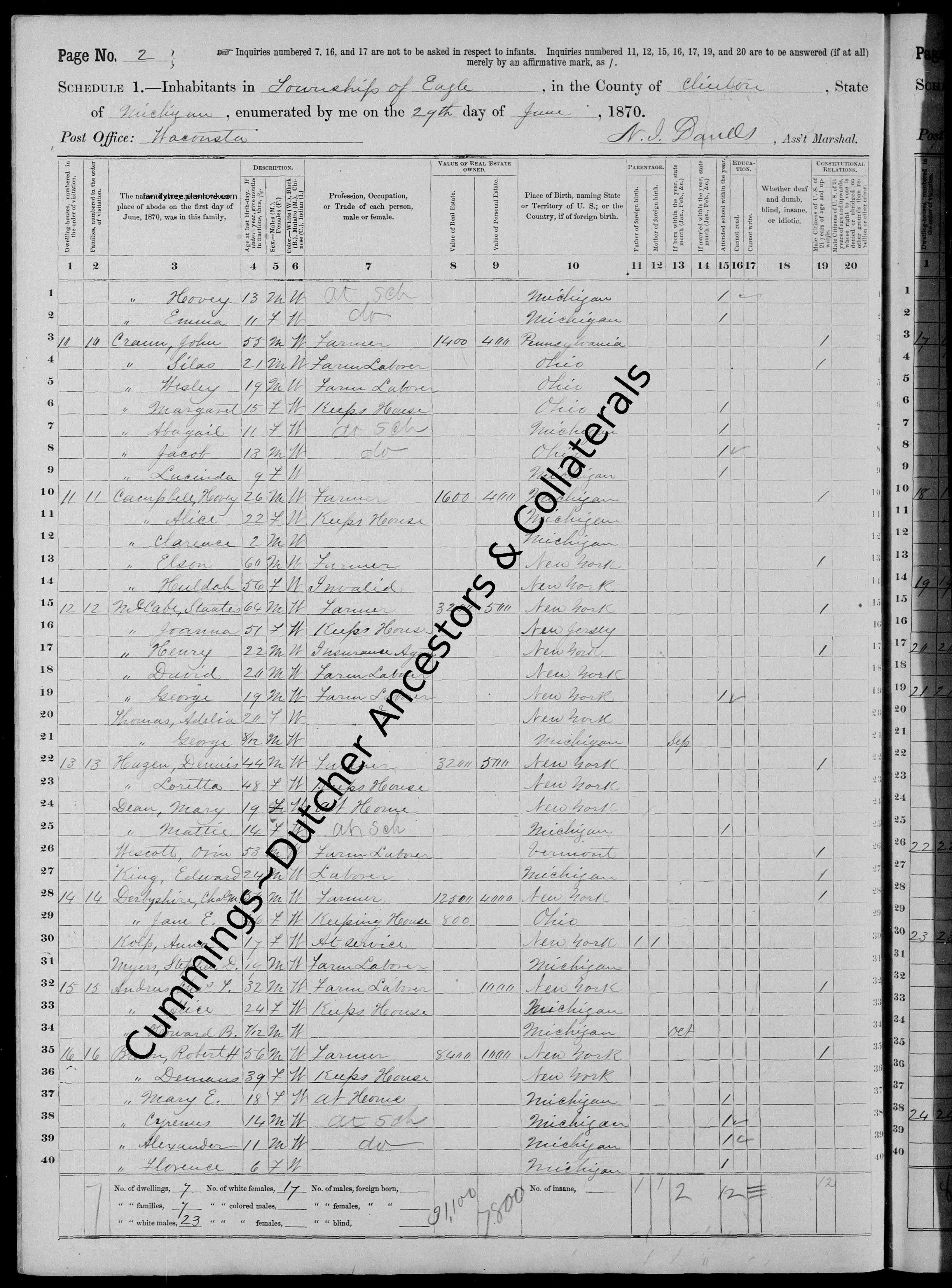 | Census | 1870 (Age 54) Eagle Twsp, Clinton County, Michgian