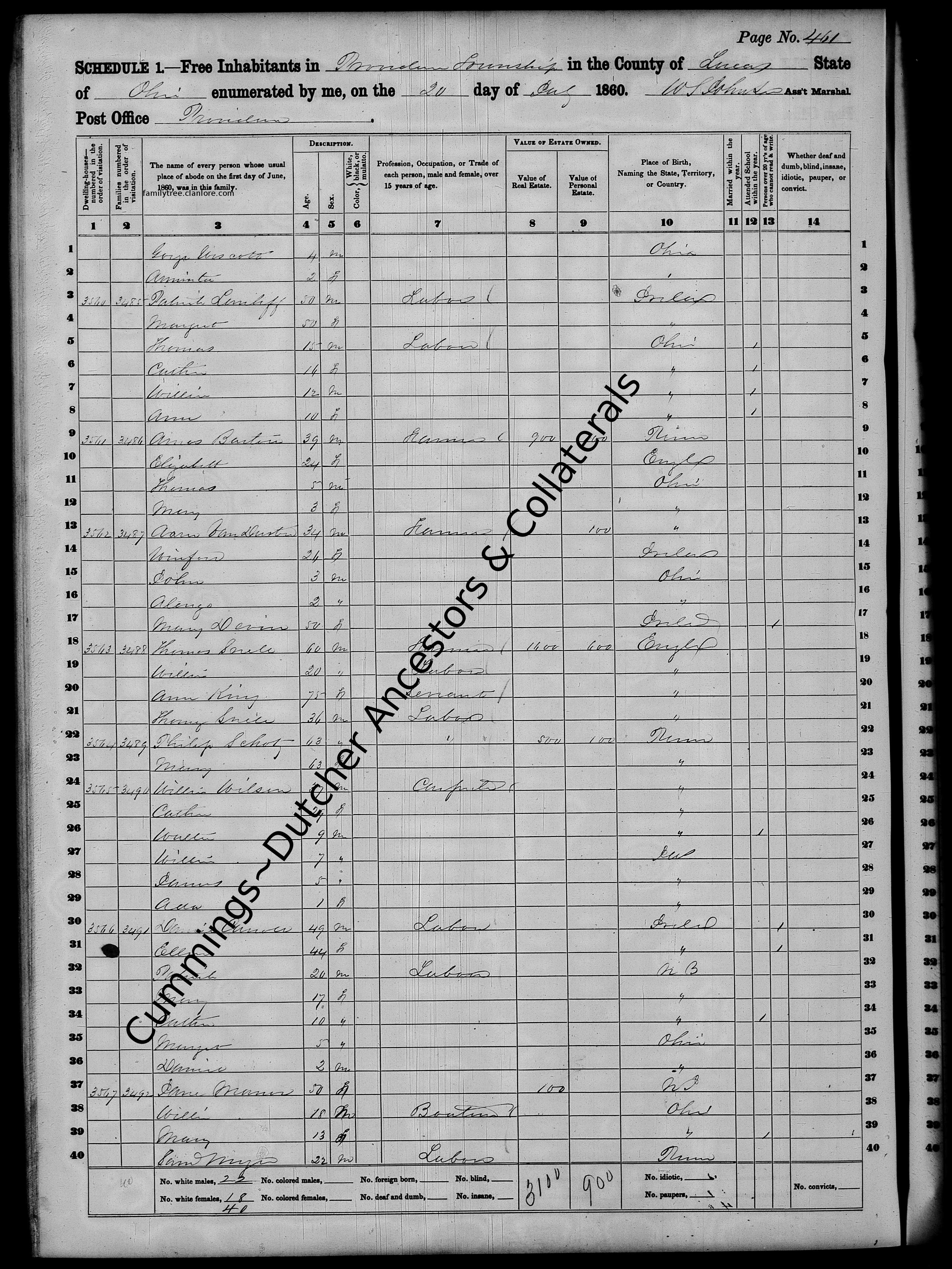 | Census | 20 July 1860 (Age 44) Providence Township, Lucas County, Ohio