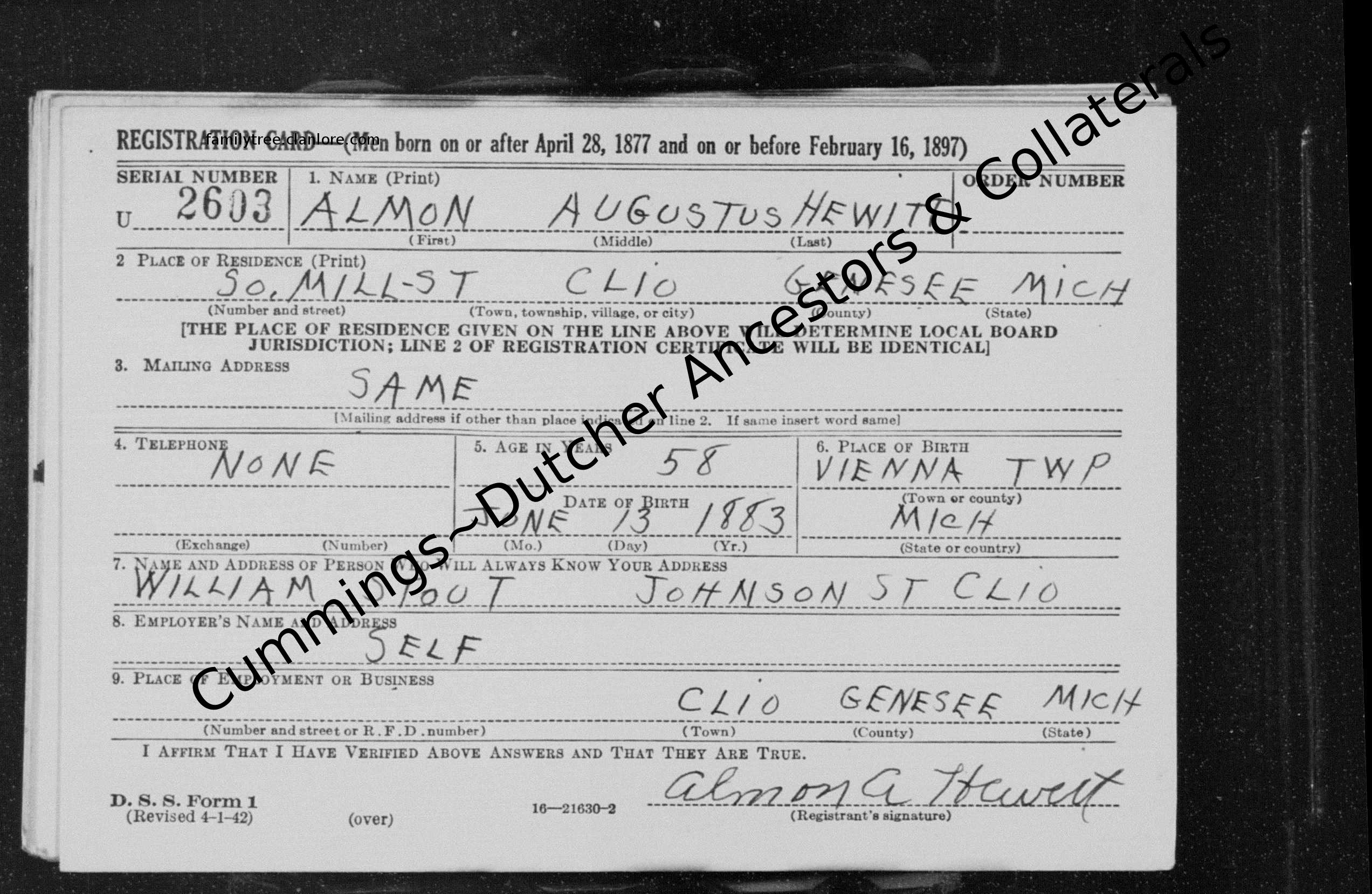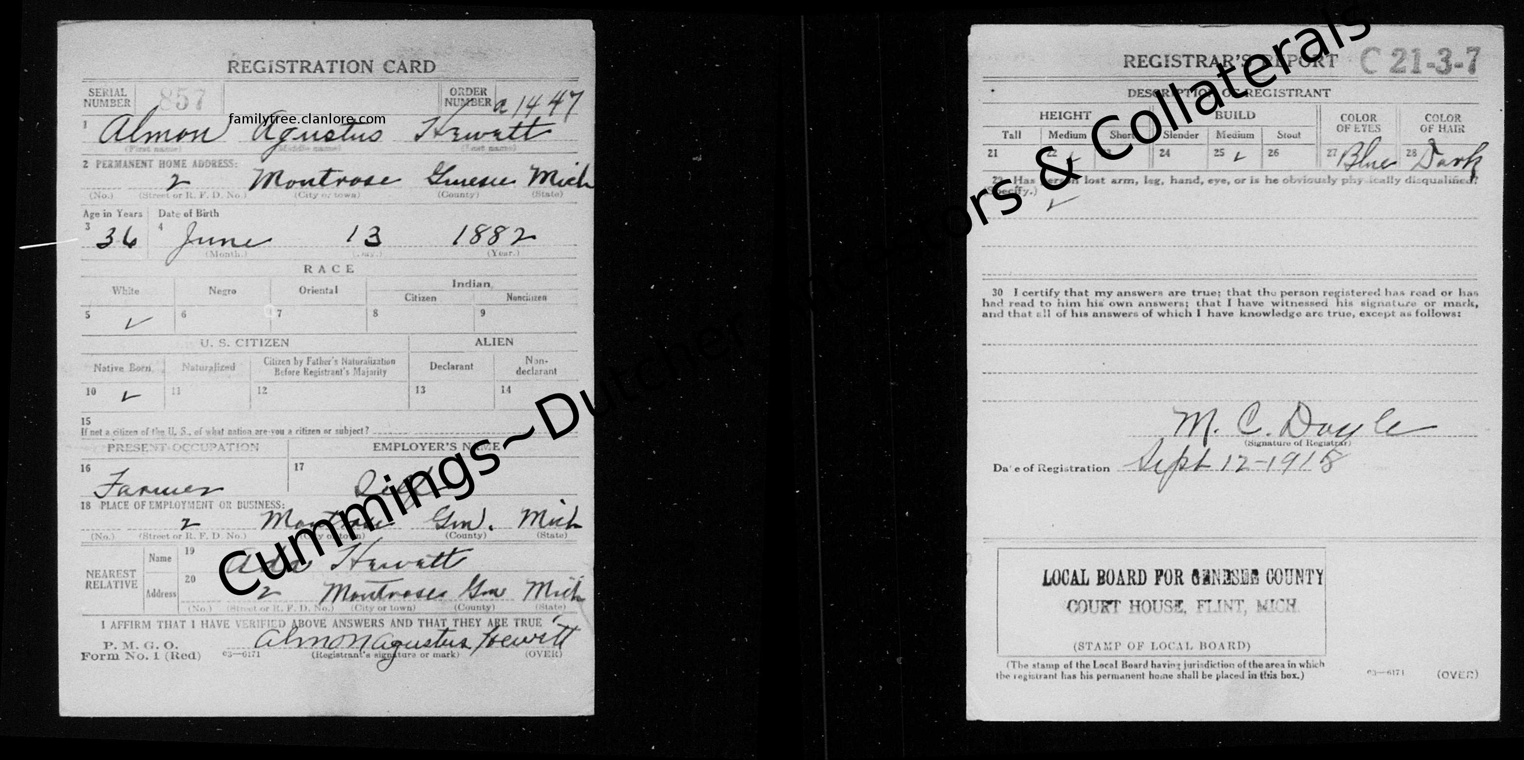 "United States World War I Draft Registration Cards, 1917-1918," database with images, FamilySearch (https://familysearch.org/ark:/61903/1:1:K6X4-KDX : 12 December 2014), Almon Agustus Hewett, 1917-1918; citing Genesee County, Michigan, United S tates, NARA microfilm publication M1509 (Washington D.C.: National Archives and Records Administration, n.d.); FHL microfilm 1,675,572.