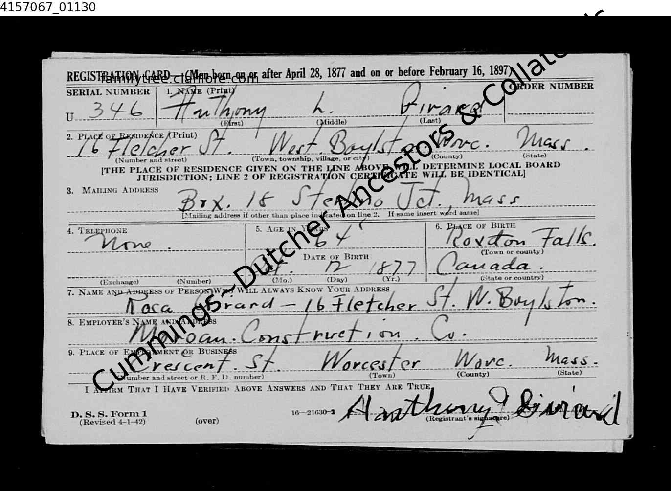 MAIN SOURCE: Anthony's WWII draft card connects his location in Mass with his occupation his wife and his birthplace of Roxton Falls, Quebec. That birthplace is what differentiates him from all the other Girards and Anthony Girards born in the s ame time frame. |