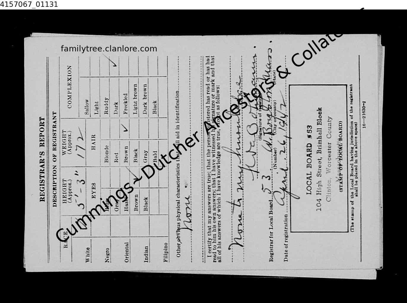 WWI Draft | His description: Short Height, Medium build, Brown eyes and Dark Brown Hair. 12 September 1918 (Age 40) West Boylston, Worcester Co., Massachusetts