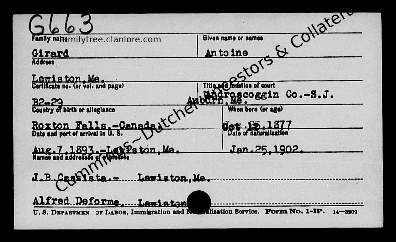 "United States, New England Petitions for Naturalization Index, 1791-1906," database with images, <i>FamilySearch</i> (https://familysearch.org/ark:/61903/1:1:VXRW-MSG : 11 March 2018), Antoine Girard, 1902; citing Maine, NARA microfilm publicat ion M1299 (Washington D.C.: National Archives and Records Administration, n.d.), roll 74; FHL microfilm 1,429,744. |
