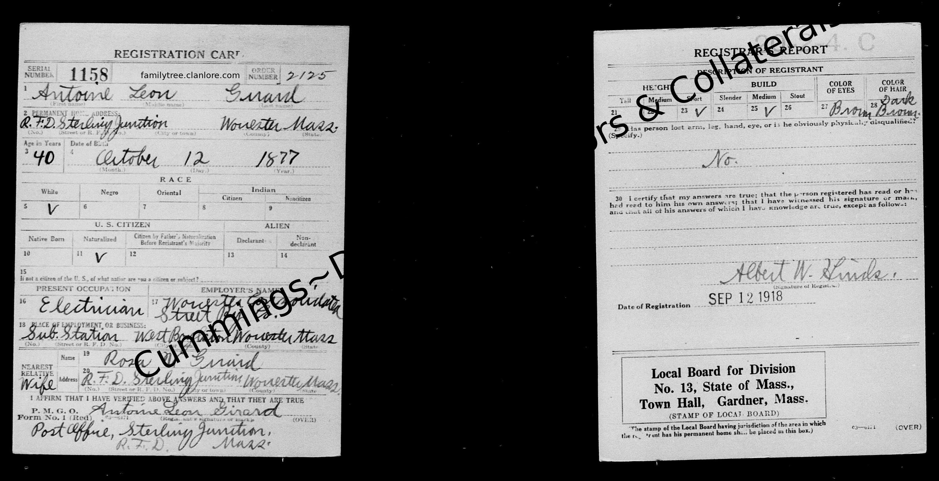 "United States World War I Draft Registration Cards, 1917-1918," database with images, FamilySearch (https://familysearch.org/ark:/61903/1:1:KZN6-8SV : 13 March 2018), Antoine Leon Girard, 1917-1918; citing Gardner City no 13, Massachusetts, Uni ted States, NARA microfilm publication M1509 (Washington D.C.: National Archives and Records Administration, n.d.); FHL microfilm 1,684,565. |