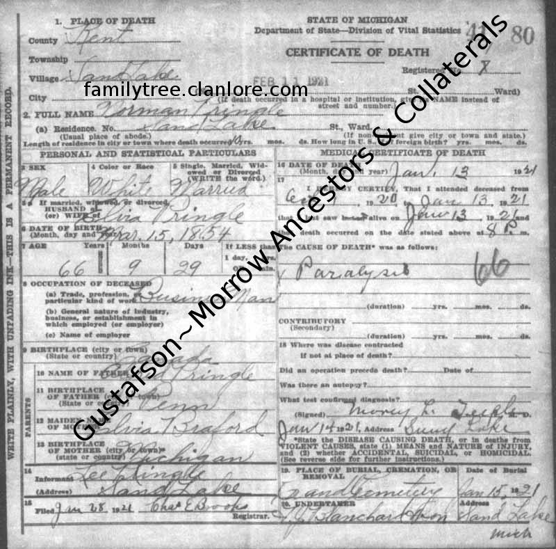 married Norman Pringle on 5 Jan 1881 at Solon, Kent Co Mich. He was