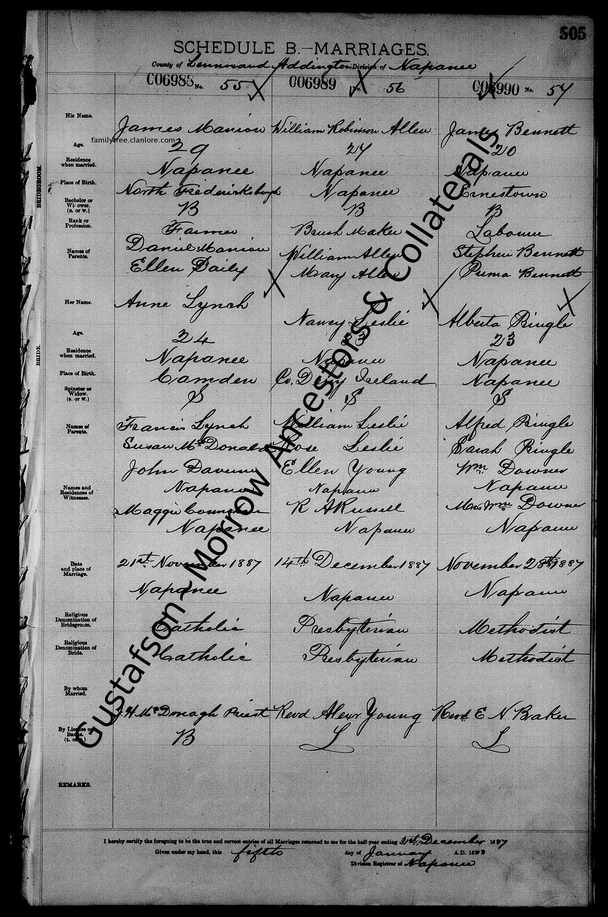 Marriage | James G Bennett - View family 28 November 1887 (Age 23) Napanee, Lennox and Addington, Ontario, Canada |