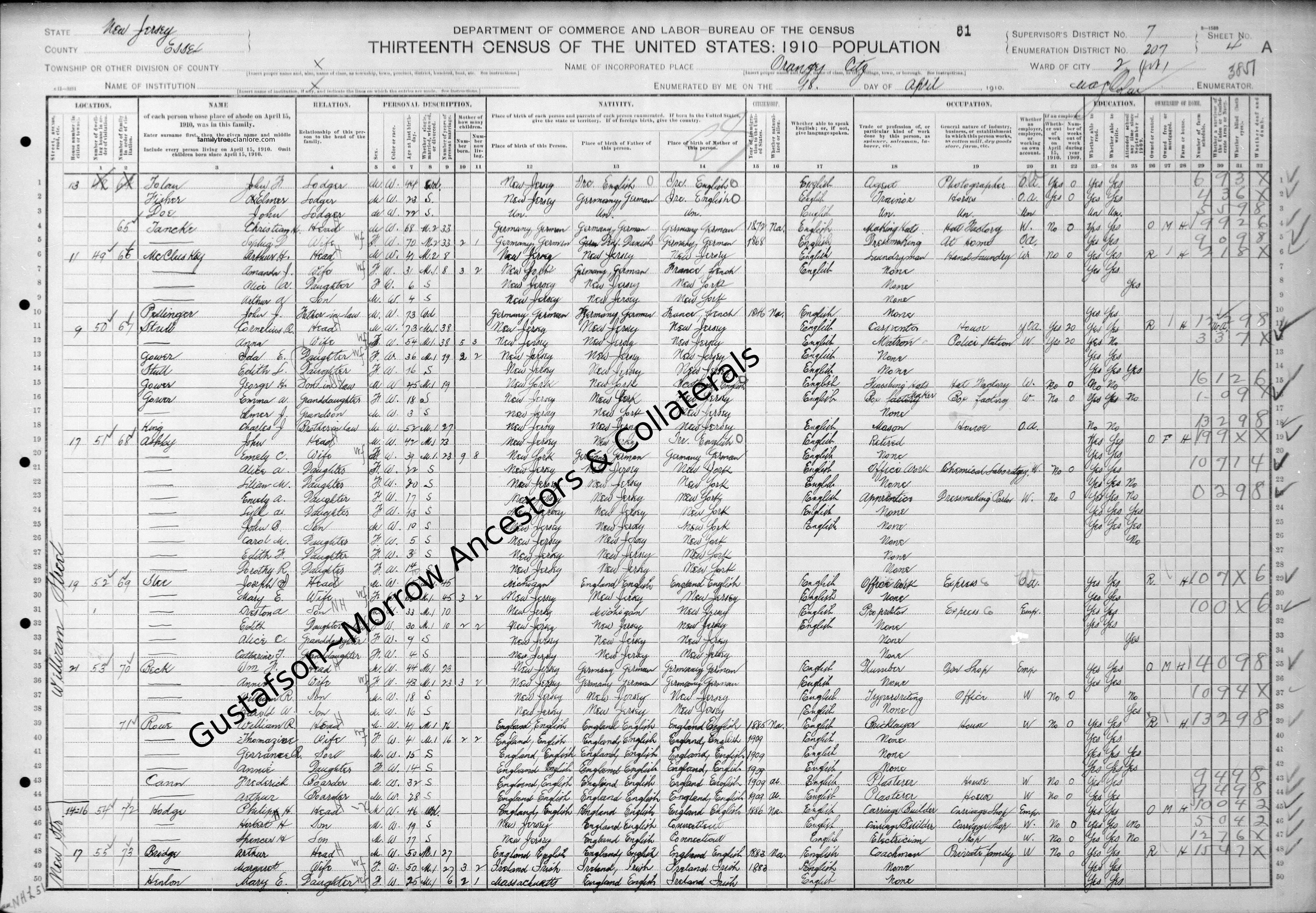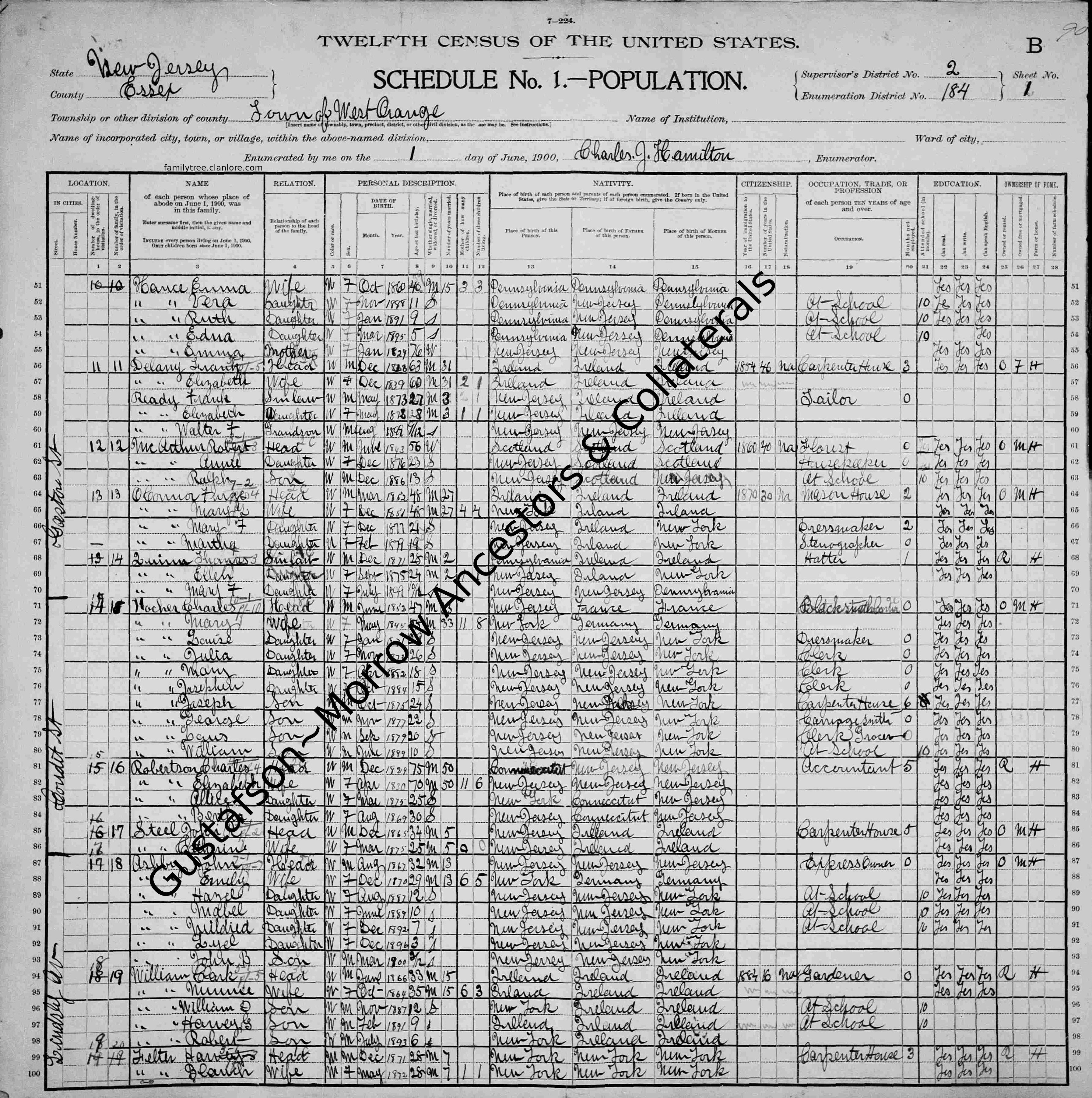 Census | John Ashby - View family 1900 (Age 29) Town of West Orange, Essex Co., New Jersey Address: 17 Lindsley Ave |
