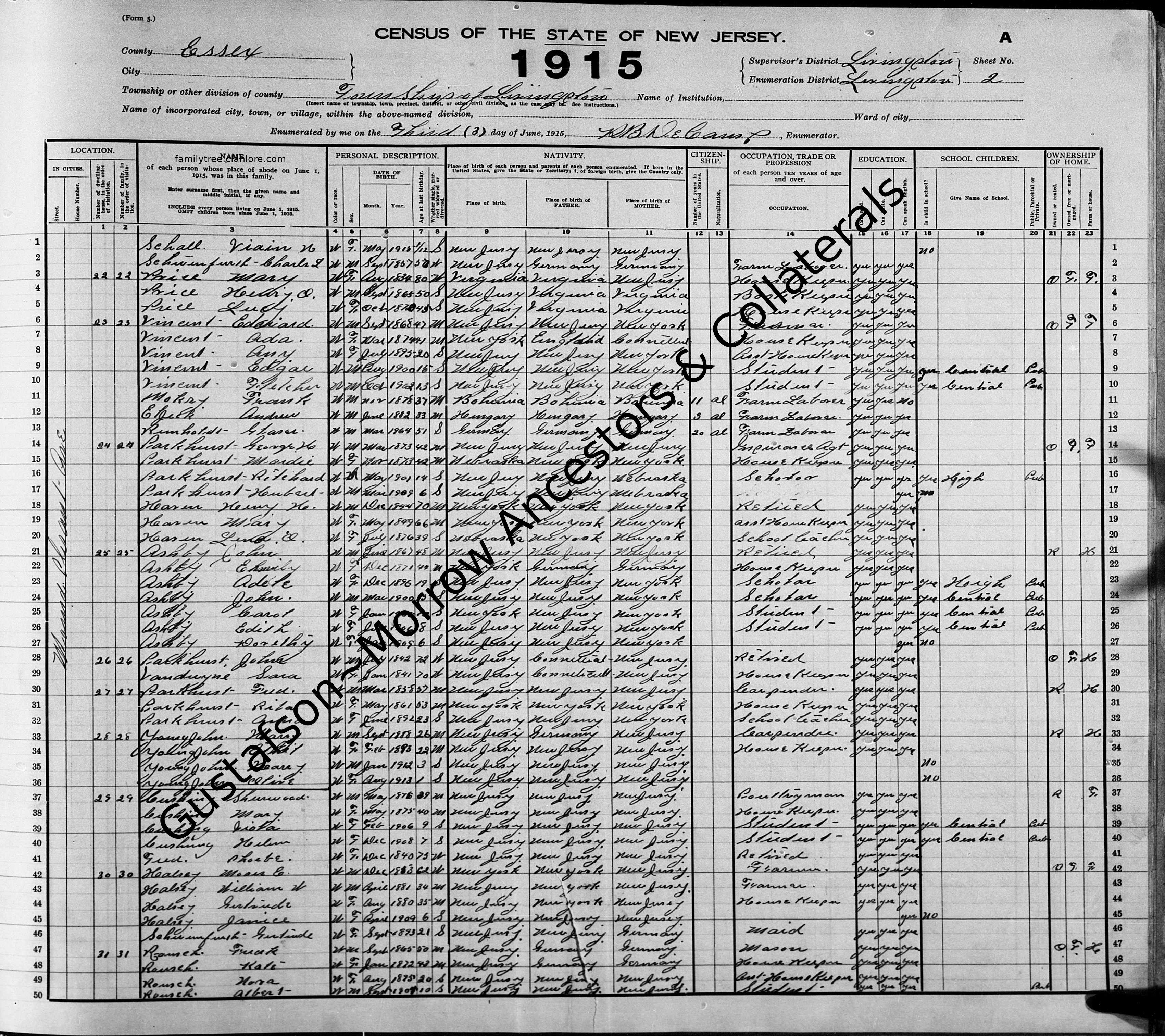 Census | John Ashby - View family 1915 (Age 44) Township of Livingston, Essex Co., New Jersey Address: Mount Pleasant Ave Note: New Jersey State Census |